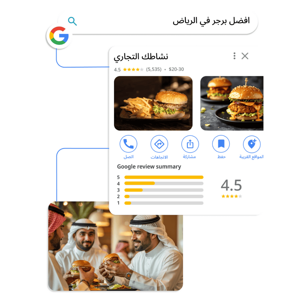 زبائنك الراضيين يقيموك بكلماتهم، و تظهر آراهم على قوقل - ترفع حضورك و تزيد ثقة الناس فيك مع كل نجمة جديدة.